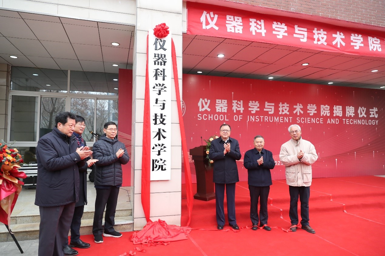 卢建军、郭东明、欧阳晓平、房建成、蒋庄德、房喻为仪器学院揭牌。